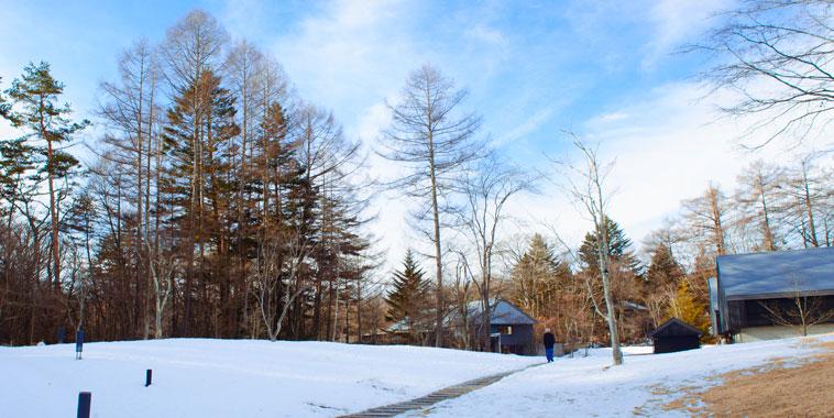 年初時東京忽下一場大雪,釀成雪災,幸運地到達這裡雪霽天晴,只是空氣較寒凍,戶外零下10度,地上、草叢中積雪未消,如霜霰一般,一簇簇地,有些結冰,路走起來很滑溜,一種急凍後的冷肅。