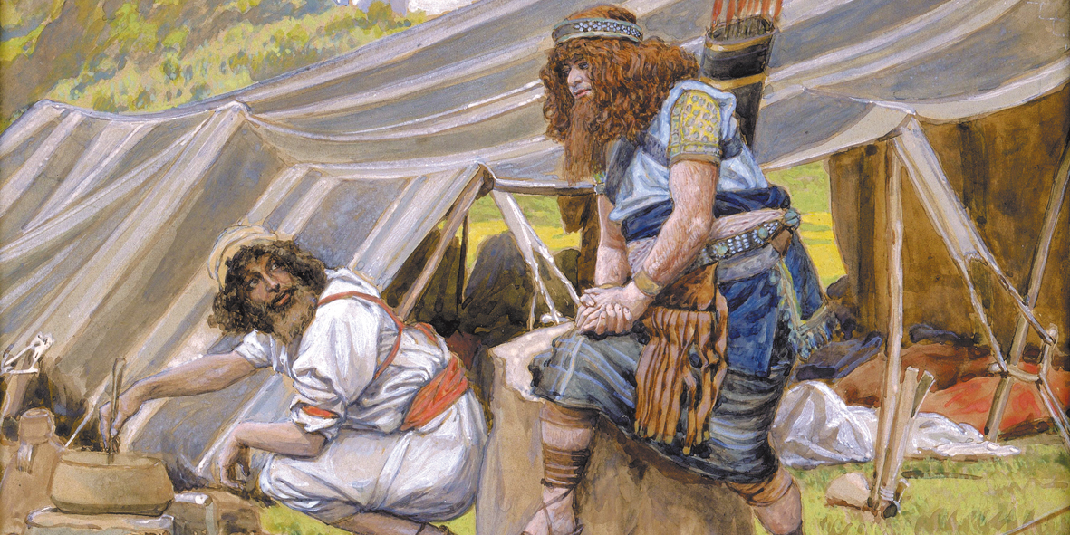 但雅各可能常為自己次子的身分而煩惱或納悶吧!沒有長子名分的加持,他將來怎麼可能強於他的哥哥?所以,翻轉名分上的劣勢可能常在他的思考中。有天,以掃打獵回來,看見弟弟所準備的餅和紅豆湯,垂涎三尺;雅各見機會來了,就提出交易,以食物換得哥哥長子的名分。