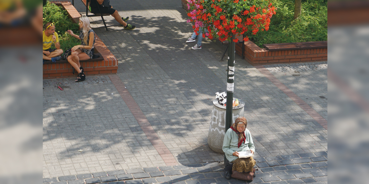 她的兒女呢?或是老伴已然過世,她沒有兒女?還是被兒女狠心的拋棄。甚至,過去的戰爭,奪走了她所有的一切,包括她美好的回憶。但是,她依然活著,靠著一點點陽光,以及路人施以的援手,感覺到還有愛。