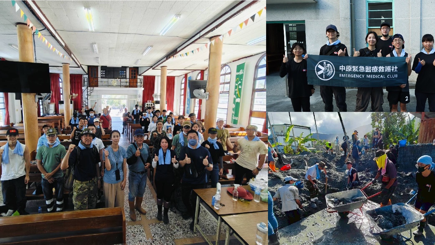 中原大學與馬太鞍長老教會合作,團結學生志工之力,協助災民重建家園(左圖,前排中為馬太鞍教會楊阿華牧師);中原「緊急醫療救護社」志工參與災區服務行動(右上);師生攜手為花蓮馬太鞍災區重建家園」行動,清理溝渠淤泥。(圖/中原大學提供)
