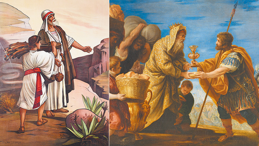 左圖:亞伯拉罕獻以撒,由英國畫家Walter Jenks Morgan繪。右圖:〈亞伯拉罕與麥基洗德〉,由西班牙畫家Juan Antonio de Frías y Escalante繪製。
