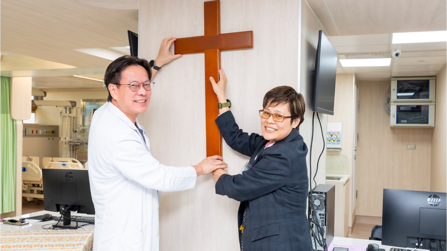 陳穆寬總院長與肯當•迪洛安牧師共同將十字架掛在加護病房,象徵上帝的愛與平安和醫護人員及病人同在。(圖/彰基提供)