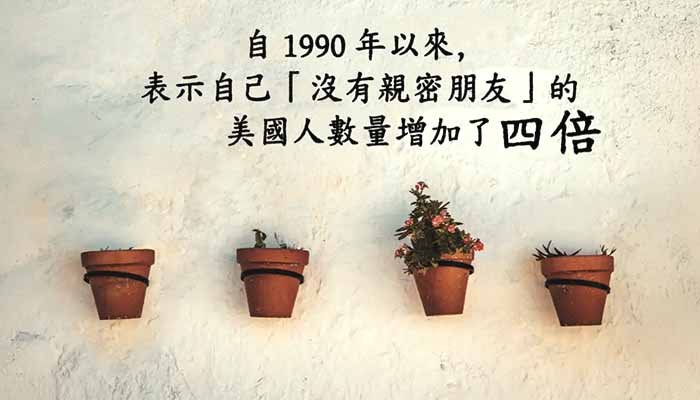 根據 2021 年美國生活研究中心(Survey Center on American Life) 的報告,自 1990 年以來,表示自己「沒有親密朋友」的美國人數量增加了四倍—— 如今有 12% 的人表示沒有親密朋友,而 1990 年時僅為 3%。研究人員指出,雖然興趣活動能帶來互動,但它們無法取代那些在你消失時仍會主動關心你的朋友。