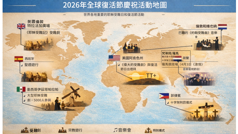 【編譯余友梅/報導】2026年復活節期間,全球各地主要城市再次以不同形式紀念耶穌的受難與復活。從歐洲的宗教遊行、美洲的大型受難劇,到串流平台與社群媒體上的影像敘事,復活節已不再只是教會內部的節期,而逐漸轉變為跨越文化、藝術與媒體的公共事件。