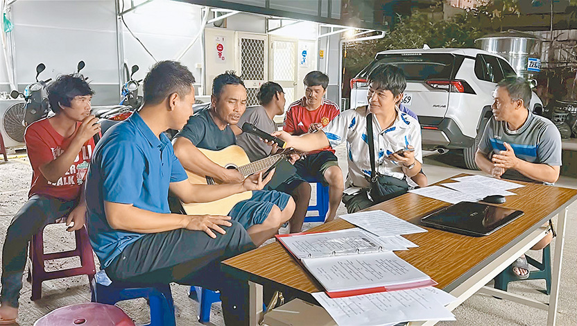 阿董在工地小組聚會裡彈吉他。(照片皆作者提供)